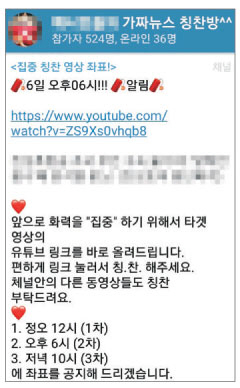 이날 문화일보 취재 결과 여론 조작에 참여하는 네티즌들이 모이는 주 무대는 해외 온라인 메신저 ‘텔레그램’에 개설된 한 단체 채팅방(사진)이다. 이들은 문재인 정부의 정책을 비판하는 정치 평론 영상이나 조국 법무부 장관의 퇴진을 촉구하는 집회 영상 등에 대해 낮 12시·오후 6시·오후 10시 등 하루 세 차례 시간대를 정해 놓고 ‘가짜뉴스’라며 유튜브 측에 신고하는 한편 비난 댓글을 집중적으로 달고 있다. 유튜브 측의 규제를 피하기 위한 팁도 공유된다. 이들이 운영하는 사이트엔 ‘공지에서 칭찬 대상을 확인하고, 최근 날짜 순으로 가능한 한 많은 영상을 칭찬하라’는 활동 수법이 안내되고 있다.