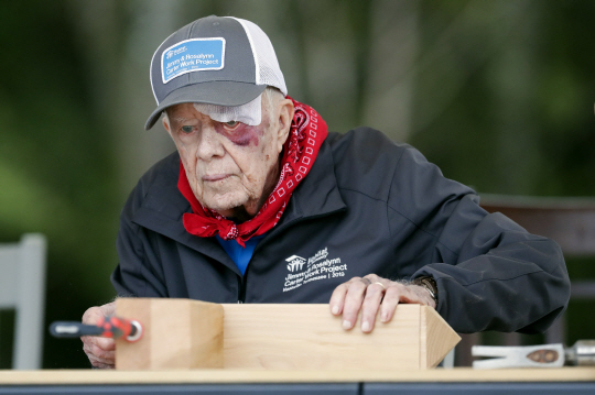 지미 카터 전 미국 대통령이 자택에서 넘어져 이마를 14바늘 꿰매는 상처를 입었으면서도 7일 무주택자를 위한 해비타트운동 현장에서 봉사활동을 벌이고 있다.