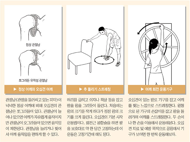 어깨가 아파서 움직이기 힘들다면 대부분 오십견 증상으로 인한 것입니다. 오십견은 꼭 오십 대에만 발생하지 않습니다. ‘유착성 관절낭염’이라고도 하는데 어깨 관절이 굳어버리는 병입니다. 이 병에 걸리면, 팔을 머리 위로 들 때 잘 안 올라갑니다. 밤에 잘 때도 어깨가 아파서 잠들기 힘듭니다.