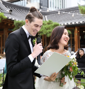 한국에서는 음식이 잔치에서 중요한 부분을 차지하기 때문에 걱정도 조금 했는데요. 고민 끝에 채식 음식 중에서도 가장 맛있고 좋은 음식을 대접하자고 결정 내렸죠. 재료를 전부 유기농으로 준비하고, 식품학과 교수를 섭외해 결혼식 음식을 부탁드리기도 했어요. 서른 가지의 잔치 음식을 대접했습니다.