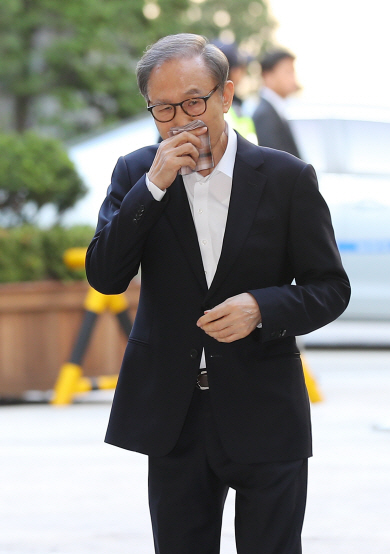 이명박 전 대통령이 21일 서울 서초구 서울중앙지방법원에서 열린 항소심 36차 공판에 출석하기 위해 법원 청사로 들어서고 있다.