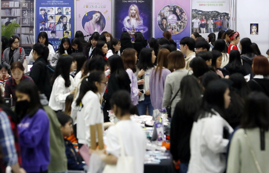 아이돌 굿즈(제품)와 애장품을 자유롭게 사고파는 K-팝 굿즈 플리마켓 행사가 열린 20일 서울 강남구 삼성동 코엑스에서 K-팝 팬들이 스타의 애장품을 사기 위해 행사 부스를 둘러보고 있다.