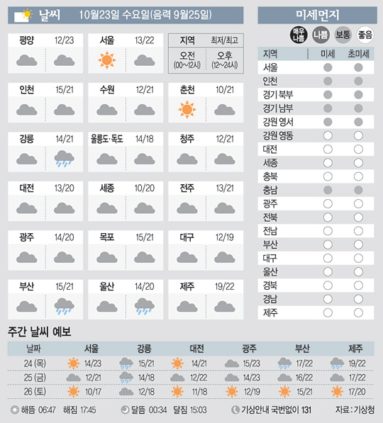 <날씨이야기>10월23일 수요일(음력 9월25일)