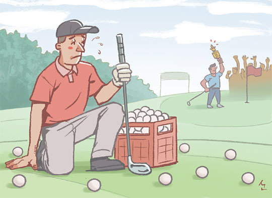 문제는 들이는 노력에 비해 실력이 늘지 않는다는 점이다. 비슷한 시기에 골프를 시작한 친구들은 벌써 80대를 치고 있고 그 중 몇몇은 소위 ‘싱글’의 반열에 올랐다. 가끔 드라이버가 잘 맞는 날이면 90대를 기록할 때도 있지만, 그는 몇 년째 100타 언저리를 맴돌고 있다. 하도 실력이 늘지 않아 ‘타고난 재능이 부족한가’라고 스스로를 의심하기도 했다. 급기야 학창시절 자신보다 운동신경이 둔했던 몸치 친구에게까지 내기골프에서 밀리자 초조함과 좌절감은 한계에 다다랐다. 하루에도 수십 번씩 ‘이놈의 골프, 이제 그만 때려치울까 보다’라는 생각이 들다가도 어느새 다시 연습장에서 공을 치고 있는 자신의 모습에 혼자 헛웃음을 짓곤 했다. 학교 다닐 땐 그 어렵다는 미적분도 혼자서 척척 풀던 그인데 골프는 왜 이리도 어려운 것일까?
