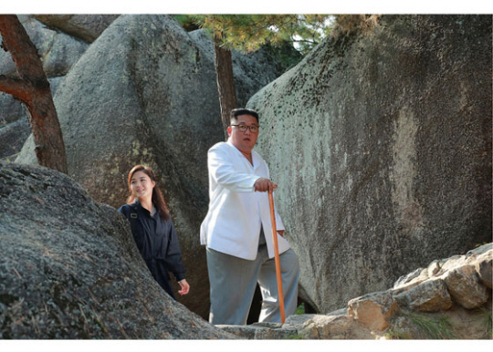 김정은(오른쪽) 북한 국무위원장이 부인 리설주 여사와 함께 금강산을 오르고 있는 사진을 북한 노동신문이 23일 공개했다. 리 여사가 북한 매체에 등장한 것은 4개월여 만이다.