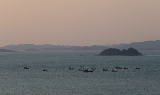 중국 어선들이 27일 인천 옹진군 연평도 인근 서해상에서 불법조업을 하기 위해 일몰을 기다리고 있다. 해양경찰은 가을철 성어기를 맞아 중국 어선들의 불법조업을 집중 단속해 지난 25일 중국 어선 3척을 나포했다.