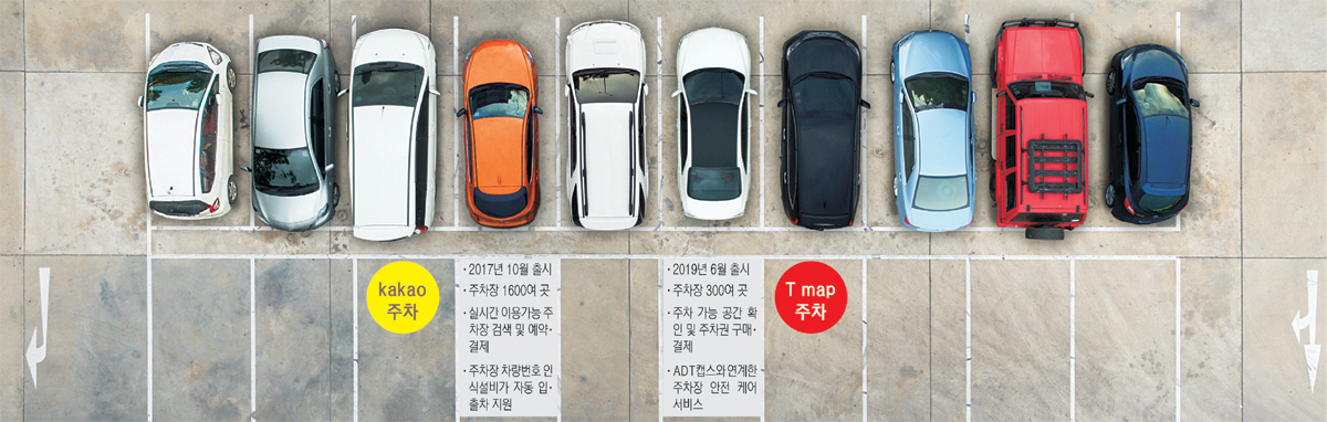 현재 카카오와 SK텔레콤은 자율주행차 시대의 화룡점정이 될 주차 시장에 심혈을 기울이고 있다. 주차 시장에 먼저 발을 디딘 건 카카오다. 카카오는 지난 2016년 주차장 예약 스타트업인 파킹스퀘어를 인수하고, 2017년 10월부터 카카오 주차 서비스를 카카오 T 앱을 통해 제공하고 있다. 현재 서울과 수도권 일대 제휴 주차장만 대형빌딩·백화점·호텔·공항 등 1600여 곳이다. 출시 초기에는 사전 예약만 지원했지만, 지난 3월 업데이트를 통해 경차·전기차 할인, 국가유공자 할인 등을 자동 적용해주는 기능을 추가했다. 지난 7월에는 국토교통부 주관 대구시 ‘스마트시티 실증사업’ 교통(주차) 분야 사업주관사로도 선정됐다. 김태성 카카오모빌리티 주차팀장은 “카카오 주차는 주차장 검색부터 입·출차까지 모든 과정을 연결하는 커넥티드 파킹을 주도하고 있다”며 “정부와 지방자치단체가 주도하는 주차 관련 사업에 동참함으로써 이용자의 편의를 극대화하고 있다”고 말했다.