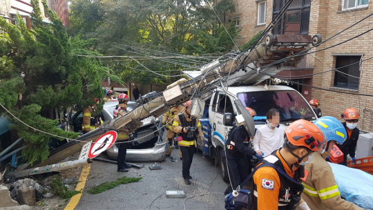 28일 서울 서대문구 홍은동에서 구급대원들이 전신주와 사다리차를 들이받은 승용차의 운전자를 구조하고 있다.