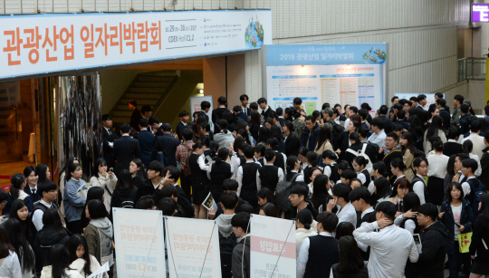 29일 오전 서울 강남구 코엑스에서 열린 ‘2019 관광산업 일자리 박람회’를 찾은 구직자들이 줄지어 입장을 기다리고 있다.