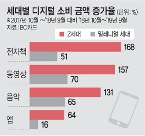 BC카드 통계에 따르면, Z세대의 최근 1년간(2018년 10월∼2019년 9월) 디지털 소비 금액 증가율은 전년 같은 기간 대비 전자책(168%), 동영상(157%), 음악(131%), 앱(64%) 순으로 조사됐다. 근접 세대인 밀레니얼 세대의 증가율이 동영상(70%), 음악(65%), 전자책(51%), 앱(16%) 등으로 100% 미만인 것과 비교할 때 Z세대가 디지털 소비를 크게 늘리고 있음을 알 수 있다.