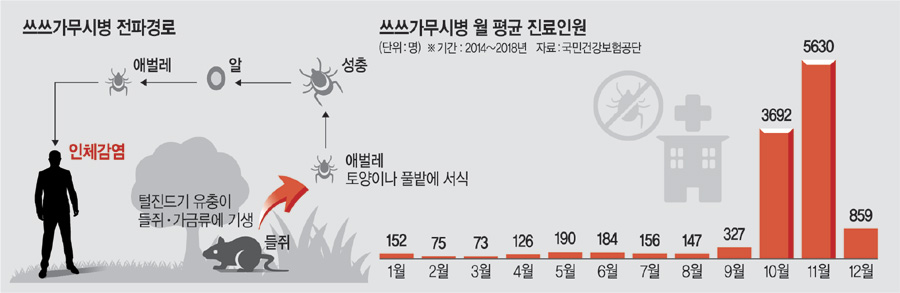 쓰쓰가무시병은 들쥐 등에 기생하는 털진드기 유충에게 물려 발생하는 질환이다. 유충 크기가 0.1㎜에 불과해 눈으로 식별이 불가능하다. 털진드기 유충에게 물리면 유충의 침샘에 있는 균이 체내로 들어오면서 6∼21일 사이 심한 두통, 발열, 오한, 근육통, 발진, 림프절 부종 등이 생기고, 물린 부위에 검은색 딱지가 생긴다. 유충에게 물린 뒤 일주일 전후로 복부 중심으로 3∼5㎜의 발진이 나타난다는 특징도 있다. 이 기간 이후에는 대부분 증상이 호전되지만 일부에서는 폐렴, 심근염, 뇌수막염 등이 합병증으로 나타날 수 있다. 고령자나 만성질환자는 사망에 이를 수 있다. 초기에 적절한 항생제 치료를 하면 대부분 별문제가 없지만 단순 감기몸살로 착각해 치료 시기를 놓치면 합병증으로 사망할 수 있다.
