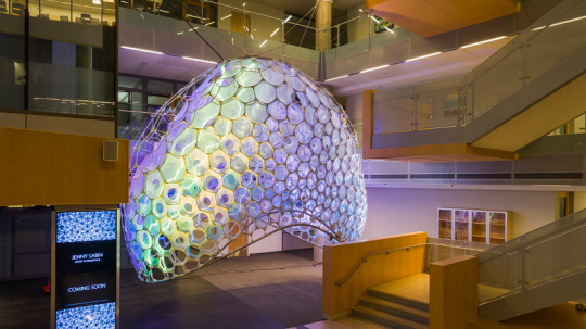 ‘기계가 인간의 감정을 읽고 반응하는 것이 가능할까?’ 사람들의 표정과 목소리 톤 등 감정을 데이터로 전환해 이를 표현해주는 ‘감정 인공지능(AI)’에 글로벌 업계가 주목하고 있다. 최근 마이크로소프트(MS)가 감정 AI를 시각적으로 구현한 건축물을 공개하면서 관심이 더욱 뜨거워지고 있다. 5일 업계에 따르면, 최근 MS 미국 워싱턴 캠퍼스 빌딩 99 로비에 감정 AI 구조물인 ‘에이다(ADA·사진)’가 설치됐다. 에이다는 타원 모양의 퍼빌리언을 형성하는 육각형 망에 1274개의 유리섬유 막대로 이뤄진 구조물로, 건물을 오가는 사람들의 표정과 목소리 톤 등 ‘감정 데이터’를 실시간으로 반영해 빛과 색을 정교하게 변환한다.