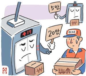 지난 9월 서울 한 아파트 단지에서 다른 단지로 이사한 최모(38) 씨는 ‘엘리베이터 사용료’로 5만 원을 내야 한다는 사실을 알게 됐다. 원래 살던 단지에서는 따로 사용료를 내지 않았었다. 새로 입주하는 단지는 주상복합으로 창문이 막혀 있어 사다리차를 이용할 수 없는 구조라 달리 선택지도 없었다. 최 씨는 “아까운 마음이 들었지만 별수 없이 내기로 했다”고 말했다.