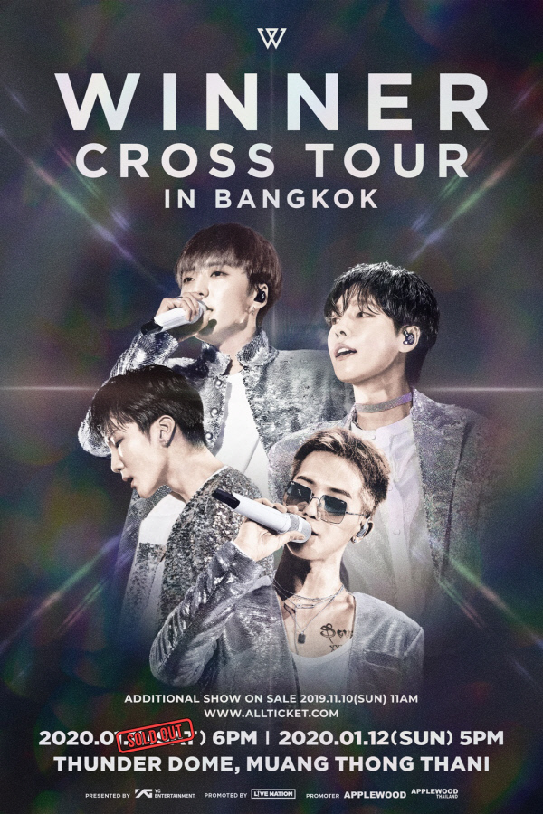 YG엔터테인먼트에 따르면 위너의 방콕 콘서트는 9일 오전 9시(현지 시각) 태국 올티켓(www.allticket.com)에서 예매 시작과 동시에 전석 매진됐다. YG엔터테인먼트는 ‘WINNER CROSS TOUR’ 방콕 콘서트 일정이 기존 예정됐던 2020년 1월 11일에 이어 12일 새롭게 추가됐다고 이날 오후 4시 공식 SNS를 통해 알렸다.
