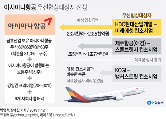 앞서 7일 마감한 아시아나 본입찰에는 현산-미래에셋 컨소시엄을 비롯해 제주항공(애경)-스톤브릿지 컨소시엄, KCGI-뱅커스트릿 컨소시엄 등 3곳이 참여했다.