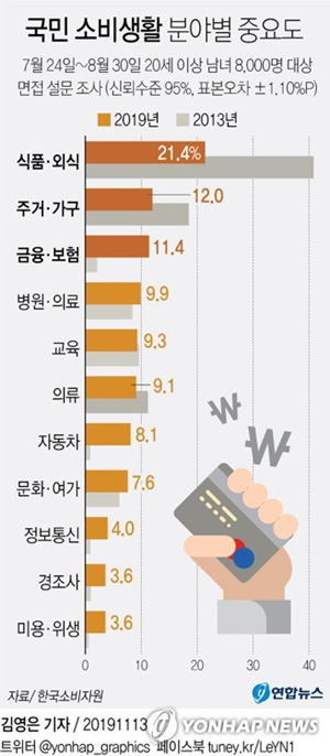 한국소비자원이 7월24일부터 8월30일까지 20세 이상 남녀 8천명을 대상으로 면접 설문 조사해 13일 발표한 ‘2019 한국의 소비생활지표’ 자료에 따르면 응답자 중 21.4%가 ‘식품·외식’을 소비생활에서 가장 중요하다고 꼽았다. 이어 ‘주거·가구’(12%), ‘금융·보험’(11.4%) 등으로 중요하다고 답했다.