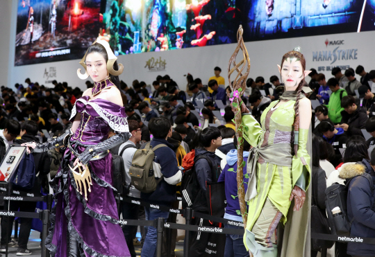 14일 부산 해운대 벡스코에서 막을 올린 국내 최대의 게임전시회인 지스타(G-STAR)에서 신작 게임 캐릭터 분장을 한 모델들이 게임을 홍보하고 있다.