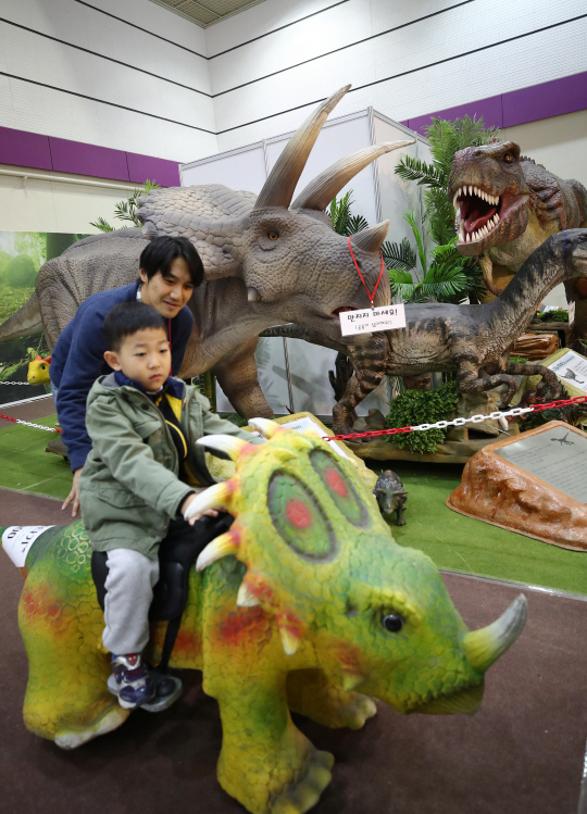 14일 서울 강남구 코엑스에서 열린 ‘서울국제유아교육전’을 찾은 한 어린이 관람객이 공룡모양의 탈 것에 올라 체험을 하고 있다.