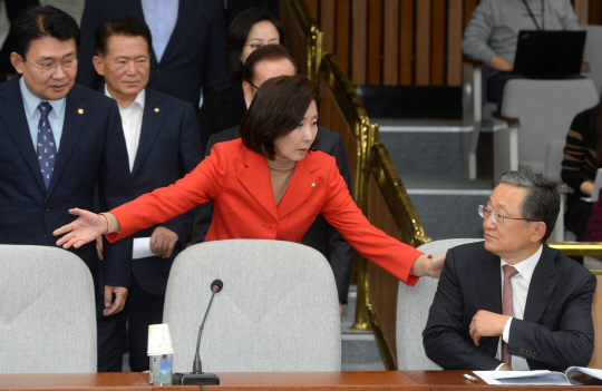 나경원(가운데) 자유한국당 원내대표가 15일 오전 국회에서 열린 원내대책회의에 참석해 앞서 와 있던 김재경(오른쪽) 의원에게 앞자리에 앉을 것을 권하고 있다.
