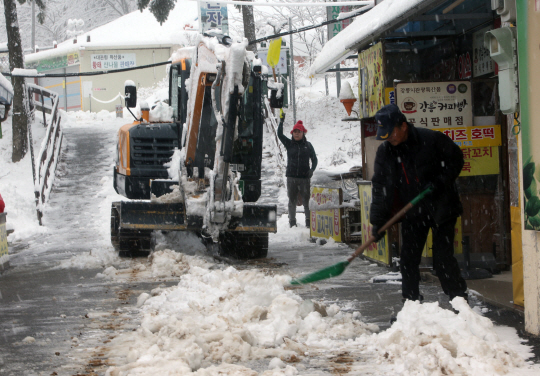 28일 강원 평창군 대관령휴게소에서 휴게소 관계자와 주민 등이 중장비를 동원해 길거리에 가득 쌓인 눈을 치우고 있다.