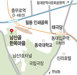 남산골 한옥마을의 물소리는 높은 나뭇가지를 흔들고 있는 바람소리처럼 잔잔해지다가 양철지붕을 때리는 빗방울 소리처럼 요란하게 울려 퍼지기도 한다. 우리는 다시 걷기 시작해 필동을 거쳐 동국대 교정을 가로지른다. 캠퍼스 안에서 무려 네 명의 스님과 스친 뒤 평화롭게 햇볕을 쬐고 있는 길고양이들을 본다. 역시 불교재단인 학교에서 볼 수 있는 자연스러운 모습이다.