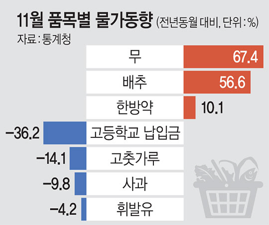 통계청은 지난해 높은 물가 상승률에 따른 기저효과가 이어진 데 따른 현상으로 풀이했다. 이두원 통계청 물가동향과장은 “지난해 기록적인 불볕더위로 11월 농산물 가격이 14.8% 급등했지만, 올해는 5.8% 하락했다”며 “(앞으로) 마이너스 물가가 나타나지 않으리라고 예상한다”고 말했다.