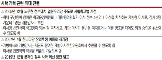 교육계에 따르면 사학개혁은 노무현 정부의 숙원 과제였지만, 한나라당의 강력 반발로 무산된 바 있다. 당시 노무현 정부는 사학의 투명성을 보장하고 비리를 막기 위해 사학법인에 개방형 이사제를 도입하고, 이사장의 배우자나 직계 존·비속의 교장 임명 제한을 강화하는 내용을 담은 사립학교법 개정안 통과를 추진했다.