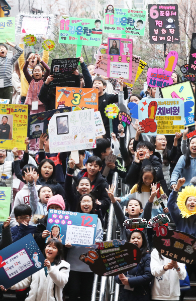 17일 경기 수원시 신풍초등학교에서 ‘2020학년도 전교 임원 선거’에 입후보한 학생들과 친구들이 푯말을 들고 선거운동을 하고 있다.