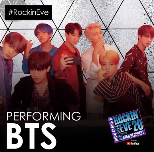 18일 미국 워싱턴포스트(WP), 버라이어티 등 외신에 따르면 방탄소년단이 오는 31일 ABC의 생방송 새해맞이 쇼 ‘딕 클라크스 뉴이어스 로킹 이브 위드 라이언 시크레스트 2020(Dick Clark’s New Year’s Rockin Eve with Ryan Seacrest 2020)’에 출연하는 것으로 확정됐다.