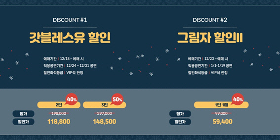 나 홀로 관람을 통해 보다 깊이 있는 감상과 재미를 느낄 혼공족을 위한 할인도 준비돼 있다. VIP석을 40% 할인된 금액으로 구매할 수 있는 ‘그림자 할인Ⅱ’ 이벤트로, 1월 1일부터 19일 공연에 한해 적용된다.