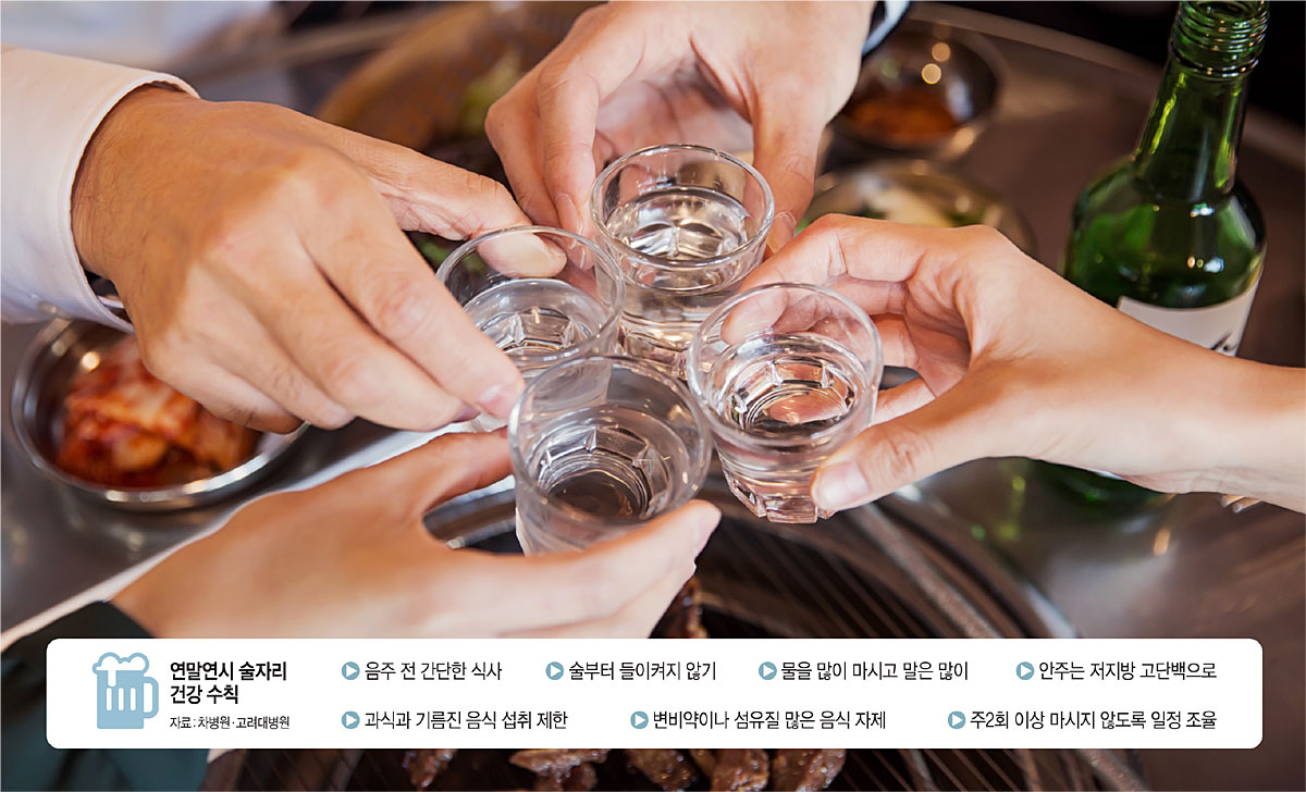 체중이 60㎏인 성인 남성의 경우 하루에 대사할 수 있는 알코올양은 80g 이내라고 알려져 있다. 이를 술 종류에 따라 환산해 보면 소주는 한 병, 맥주는 2000㏄, 포도주는 750㎖ 기준으로 한 병, 양주는 약 200㎖ 정도에 해당한다. 그러므로 자신의 몸무게에 맞춰 음주량을 결정해야 간에 무리를 주지 않는다. 음주 후에는 간이 충분히 회복할 수 있도록 휴식을 취하고 일주일에 2회 이상 마시지 않는 것이 조금이라도 피로와 숙취를 줄일 수 있는 방법이다. 간 손상이 이어지면 알코올성 지방간, 알코올성 간염 등이 발생하고 나아가 간경변증이 나타날 수 있다. 임형준 고려대 안산병원 소화기내과 교수는 “만성 간질환자의 경우 철저한 금주가 무엇보다 중요하지만, 그렇지 않은 사람의 경우 음주 시 좋은 습관을 유지하는 것이 바람직하다”고 설명했다.