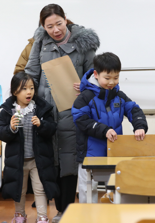 서울지역 공립초등학교의 신입생 예비소집일인 8일 서울 용산초를 찾은 예비 초등생이 교실에 놓인 의자를 만져보고 있다.