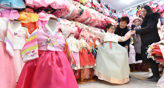 민족 대명절인 설을 앞둔 16일 경기 수원시 팔달구 영동시장에서 설빔을 장만하러 온 어린이가 한복을 입어보고 있다.