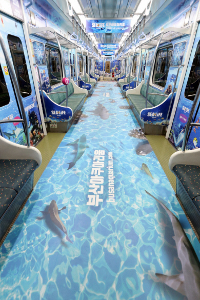 부산교통공사가 20일부터 2호선 일부 객차에 운행한 아쿠아 테마 열차 내부 모습으로 벽면에는 심해를 연상케 하는 다양한 이미지가, 바닥에는 바다 생물 등 동화 속 해저 세상을 표현했다.