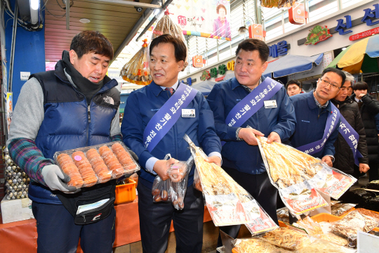 하언태 현대차 사장과 이상수 노조위원장 등 노사 대표들은 지난 20일 설 명절을 앞두고 울산 남구 수암시장을 방문해 불경기로 어려움을 겪고 있는 상인들을 격려하고 온누리 상품권으로 과일, 건어물, 수산물 등을 구입(사진)했다.