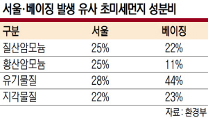 서울과 중국 베이징(北京)의 초미세먼지(PM2.5) 성분이 유사하다는 최초의 한·중 공동 연구결과가 나왔다. 특히 화석연료 사용이나 자동차 배출가스 등에서 발생하는 초미세먼지가 큰 영향을 미치는 것으로 나타났다.