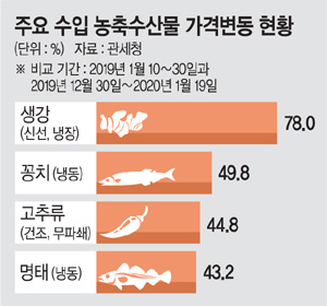 수입 수산물 분야에서는 꽁치(냉동·49.8%)와 명태(냉동·43.2%), 홍어(냉동·20.7%) 등 설 명절에 많이 사용하는 생선들 가격이 뛰었다. 고등어(냉동·7.2%) 역시 가격이 올랐다. 낙지(산 것, 신선, 냉장·-31.1%)와 아귀(냉동·-13.6%), 갈치(냉동·-13.4%), 조기(냉동·-11.7%) 가격은 하락했다. 임연수어(냉동·-9.8%)와 주꾸미(냉동·-9.0%), 바지락(산 것, 신선, 냉장·-8.3%) 가격도 하락세를 보였다.