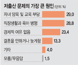 30일 문화일보의 만 19세 이상 여성 타깃 여론조사에서 저출산 문제의 가장 큰 원인으로 ‘자녀 양육 및 교육 부담’을 꼽은 응답이 29.0%로 가장 많았다. ‘직장과 육아 병행의 어려움’을 꼽은 응답이 28.8%로 뒤를 이었고 ‘경제적 여유가 없어서’(23.4%), ‘결혼을 안 하거나 늦게 결혼하는 사람이 많아서’(13.3%) 순이었다. 이는 저출산 문제 해결을 위해선 단순한 현금성 지원 정책을 뛰어넘는 종합 대책이 필요하다는 의미로 풀이된다.