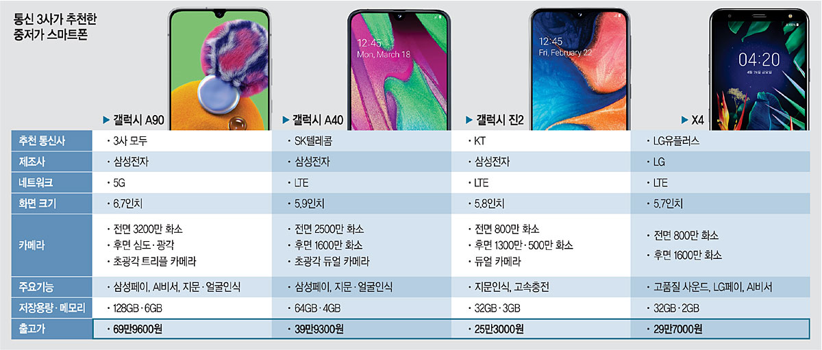 ◇통신사 추천 가성비 좋은 스마트폰은= SK텔레콤은 자사 전용 스마트폰인 삼성전자 갤럭시 A40을 추천했다. LTE 스마트폰인 갤럭시 A40 출고가는 39만9300원으로, 젊은 고객을 대상으로 한 맞춤형 스마트폰이다. SK텔레콤 고객이 4만 원대 요금제인 ‘T플랜 안심 2.5기가 요금제’(월 4만3000원)를 선택하면 공시지원금 11만6000원을 받을 수 있어 28만3300원에 가입할 수 있다. 갤럭시 A40은 SNS와 셀피에 대한 젊은 고객의 요구를 반영해 2500만 화소 전면 카메라를 도입했다. 후면 듀얼 카메라는 1600만 화소 카메라와 더욱 넓은 화각으로 촬영할 수 있는 123도 초광각 카메라가 장착됐다. 특히 갤럭시 A40은 중저가 스마트폰에서 지원되지 않던 삼성페이를 지원, 합리적인 가격에 편리한 기능을 누릴 수 있다. 이 외에도 3100mAh 용량의 배터리, 4GB 임시 저장 메모리, 64GB 내장 메모리 등 넉넉한 배터리와 메모리를 갖추고 있다.