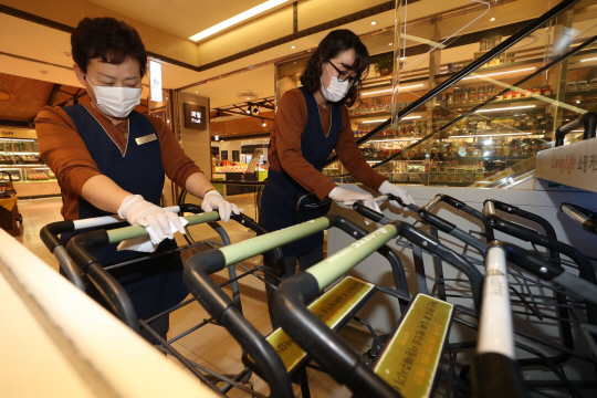 3일 오후 대구 북구 칠성동 롯데백화점 대구점 식품관에서 백화점 직원들이 신종 코로나바이러스 감염증(우한 폐렴) 확산을 방지하기 위해 고객용 카트의 손잡이를 소독하고 있다.