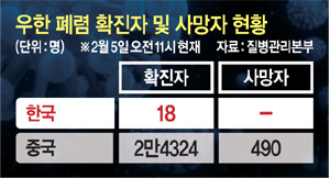 중국 국가위생건강위원회(위건위)는 5일 0시 현재 전국 31개 성·시·자치구에서 우한 폐렴 누적 확진자는 2만4324명, 사망자는 490명이라고 밝혔다. 중국 전역에서 사망자는 하루 전보다 65명, 확진자는 3887명 늘었다. 일일 사망자와 확진자 증가세는 또다시 최고치를 경신했다. 특히 발병지 우한이 포함된 후베이(湖北)성은 중국 당국이 의료진과 장비 신규 투입 등 총력전을 펼치고 있음에도 갈수록 상황이 악화하고 있다.