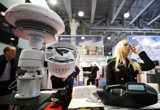 지난 5일(현지시간) 러시아 모스크바 크로코스 엑스포 국제전시회장에서 열린 ‘국가 항공 인프라 포럼(NAIS) 2020’에 DR-500 드론 탐지 레이더가 전시돼있다.
