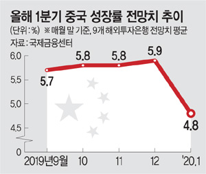 신종 코로나바이러스 감염증(우한 폐렴) 확산에 따른 우려가 커지면서 9개 해외투자은행(IB, 바클레이즈·뱅크오브아메리카-메릴린치·씨티·크레디트스위스·골드만삭스·JP모건·HSBC·노무라·UBS)이 올해 1분기 중국 경제성장률 전망치(평균)를 5.9%(지난해 12월 말 기준)에서 4.8%(올해 1월 말 기준)로 1.1%포인트나 낮췄다.