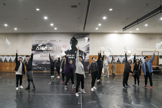 연습 장면을 보는 내내 가슴이 울렁거렸다. 젊은 배우들이 뿜어내는 패기에 흠뻑 매료됐기 때문이었다. 지난 4일 찾은 뮤지컬 ‘스웨그 에이지: 외쳐, 조선!’ 연습실(사진)은 겨울 추위와 신종 코로나 바이러스 공포를 넘어서는 열기로 뜨거웠다. 배우들 뿐만 아니라 스태프들 전체가 흥감에 젖어 박수를 치거나 함성을 함께 지르며 분위기를 달궜다.