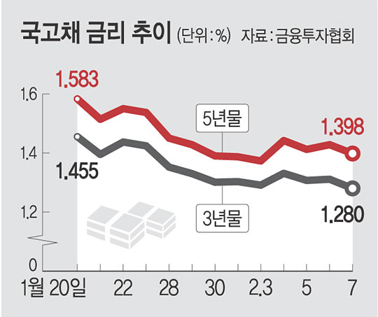 10일 오전 9시 30분 현재 서울 채권시장에서 국고채 3년물 금리는 전 거래일 대비 0.9bp(1bp=0.01%포인트) 하락한 1.271%, 5년물 금리는 1.5bp 내린 1.383%에 거래되며 하락세를 이어가고 있다. 금융투자협회에 따르면, 지난 7일 국고채 금리는 3년물의 경우 3.1bp 떨어진 1.280%, 5년물이 3.0bp 내린 1.398%, 10년물은 2.9bp 하락한 1.601%에 거래를 마치는 등 일제히 하락했다. 국내에서 우한 폐렴 첫 확진자가 나온 지난달 20일 국고채 3년물 금리가 1.455%였던 것과 비교하면 급격히 떨어진 것이다. 채권 금리 하락에 따라 채권형 펀드에 자금 유입도 활발해지고 있다. 금투협에 따르면, 지난 7일 기준 이달 중 채권형 펀드에는 9460억 원 규모의 자금이 유입돼 주식형 펀드 유입 자금(1560억 원)의 약 6배 수준을 나타냈다.