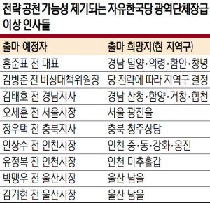 공관위는 다른 광역단체장급 인사들의 출마 지역에 대해서도 본격적인 논의에 들어간다는 계획이다. 한 공관위원은 “김병준 전 비상대책위원장 등 대표급 인사뿐 아니라 광역단체장급도 전반적인 선거 전략 속에서 함께 논의해야 한다”고 말했다. 이는 총선 승리를 위해 가능한 자원은 모두 활용하겠다는 뜻으로 풀이된다. 이에 따라 광역단체장을 지낸 일부 인사들은 공천 신청 지역이 아닌 곳에 배치될 가능성이 있다.