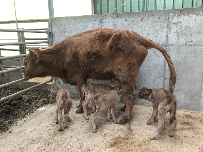 김 씨는 수의사의 도움 없이 직접 4마리의 송아지를 받았다. 김 씨는 14일 오후 처음 암송아지를 낳았을 때 너무 작아 실망했다. 이후 2시간여 뒤 송아지 상태를 살펴보기 위해 다시 찾았을 때 수송아지를 낳았고, 이어 두 마리가 더 태어났다고 했다. 송아지들은 출산 예정일(3월 5일)보다 일찍 태어났다. 어미 소는 25개월령으로 이번이 초산이다.