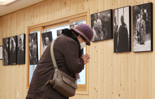 19일 서울 성북구 길상사에서 열린 법정 스님 입적 10주기 추모법회에 참석한 한 신도가 법정 스님의 생전 사진을 보고 합장하고 있다.
