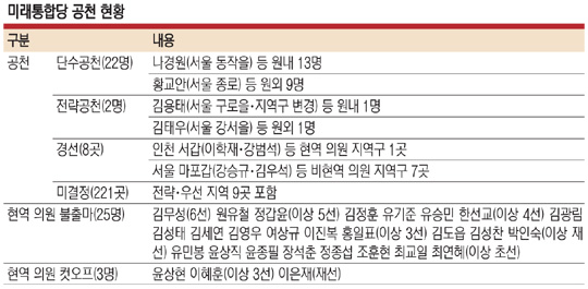 한 중진 의원은 “19대 총선에서 당시 새누리당(한국당 전신)이 총선 3개월 전만 해도 야당 지지율보다 10%가량 낮았다”며 “하지만 지역 의원 교체율을 40%대까지 끌어올리면서 결국 총선에서 승리했다”고 설명했다. 당시 야당인 민주통합당의 지역 의원 교체율은 30%대에 머물렀다. 통합당은 오는 28∼29일 인천 서갑, 서울 서대문을, 경기 의정부을 등 8곳 경선을, 가상번호(안심번호)를 활용한 여론조사로 진행한다.