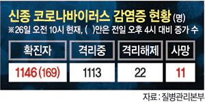 질병관리본부(질본)에 따르면 이날 오전 9시 현재 국내 코로나19 확진자는 총 1146명으로 전날 오후 4시 대비 169명이 늘었다. 대구·경북지역 환자만 153명이 늘어 추가 확진자의 절대다수를 차지했다. 질본 발표를 기준으로 대구는 누적 677명, 경북은 267명의 확진자가 발생했다. 국내 사망자는 1984년생 몽골인(875번째 확진자)이 숨지면서 11명이 됐다. 이날 오전에는 경북 칠곡에 있는 주한미군 캠프에서 병사 1명이 코로나19 확진 판정을 받았다. 오전 9시 기준으로 비교한 일별 확진자 증가 폭은 이날 현재 253명을 기록해 사상 최대치를 기록했다. 지난 18일 31번째 신천지대구교회 신도 확진자가 발생한 이래로 가파르게 늘면서 지난 23일 210명을 찍었다가 24일 207명, 25일 130명으로 소강상태를 보여 왔다.